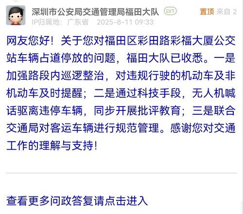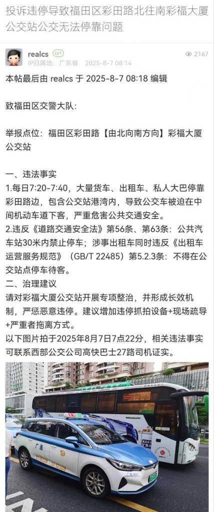 16. 帖文《投訴違停導致福田區(qū)彩田路北往南彩福大廈公交站公交無法??繂栴}》
