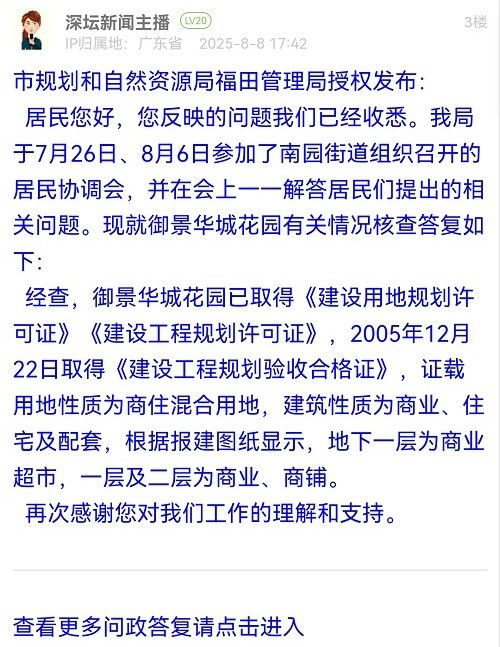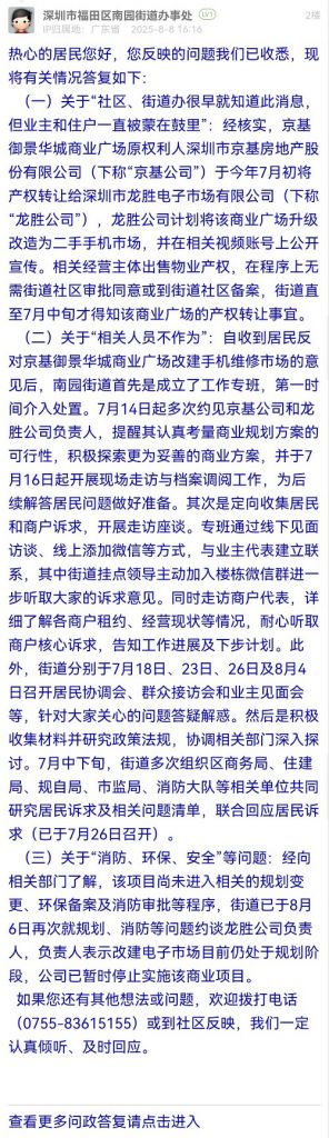 (二)關于“相關人員不作為”:自收到居民反對京基御景華城商業(yè)廣場改建手機維修市場的意見后,南園街道首先是成立了工作專班,第一時間介入處置。7月14日起多次約見京基公司和龍勝公司負責人,提醒其認真考量商業(yè)規(guī)劃方案的可行性,積極探索更為妥善的商業(yè)方案,并于7月16日起開展現(xiàn)場走訪與檔案調(diào)閱工作,為后續(xù)解答居民問題做好準備。其次是定向收集居民和商戶訴求,開展走訪座談。專班通過線下見面訪談、線上添加微信等方式,與業(yè)主代表建立聯(lián)系,其中街道掛點領導主動加入樓棟微信群進一步聽取大家的訴求意見。同時走訪商戶代表,詳細了解各商戶租約、經(jīng)營現(xiàn)狀等情況,耐心聽取商戶核心訴求,告知工作進展及下步計劃。此外,街道分別于7月18日、23日、26日及8月4日召開居民協(xié)調(diào)會、群眾接訪會和業(yè)主見面會等,針對大家關心的問題答疑解惑。然后是積極收集材料并研究政策法規(guī),協(xié)調(diào)相關部門深入探討。7月中下旬,街道多次組織區(qū)商務局、住建局、規(guī)自局、市監(jiān)局、消防大隊等相關單位共同研究居民訴求及相關問題清單,聯(lián)合回應居民訴求(已于7月26日召開)。