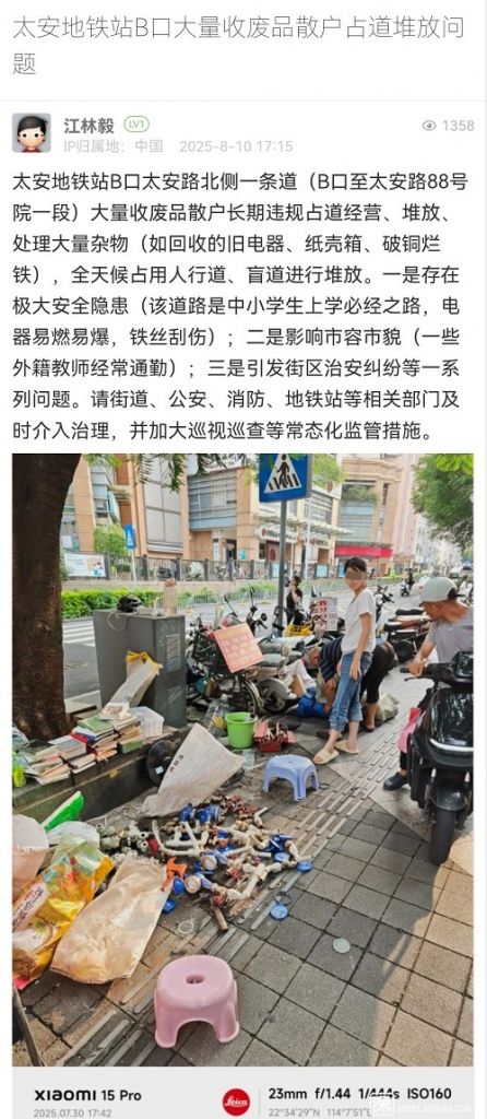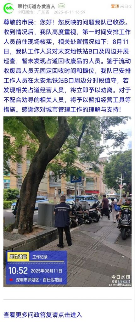 尊敬的市民:您好!您反映的問題我隊已收悉。收到情況后,我隊高度重視,第一時間安排工作人員前往現(xiàn)場核實,相關處置情況如下:8月11日,我隊工作人員對太安地鐵站B口及周邊開展巡查,暫未發(fā)現(xiàn)占道回收廢品的人員。鑒于流動收廢品人員無固定回收時間和攤位,我隊已安排工作人員在太安地鐵站B口周邊分時段值守,若發(fā)現(xiàn)相關占道經(jīng)營人員,將立即予以勸離。對于不配合勸導的相關人員,將予以暫扣經(jīng)營工具等措施。感謝您對城市管理工作的理解與支持!