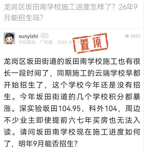 23. 帖文《龍崗區(qū)坂田南學校施工進度怎樣了?26年9月能招生嗎?》