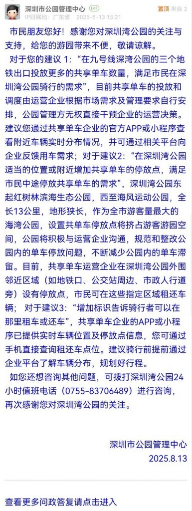 對于您的建議 1:“在九號線深灣公園的三個地鐵出口投放更多的共享單車數(shù)量,滿足市民在深圳灣公園騎行的需求”,目前共享單車的投放和調(diào)度由運營企業(yè)根據(jù)市場需求及管理要求自行安排,公園管理方無權(quán)直接干預企業(yè)的運營決策。建議您通過共享單車企業(yè)的官方APP或小程序查看附近車輛實時分布情況,并可通過相關平臺向企業(yè)反饋用車需求;對于建議2:“在深圳灣公園適當?shù)奈恢没蚋浇黾庸蚕韱诬嚨耐7劈c,滿足市民中途停放共享單車的需求”,深圳灣公園東起紅樹林濱海生態(tài)公園,西至海風運動公園,全長13公里,地形狹長,作為全市游客量最大的海灣公園,設置共單車停放點將擠占游客游園空間,公園將積極與運營企業(yè)溝通,規(guī)范和整改公園內(nèi)的單車停放問題,不斷減少公園內(nèi)的單車滯留。目前,共享單車運營企業(yè)在深圳灣公園外圍鄰近區(qū)域(如地鐵口、公交站周邊、市政人行道旁)設有停放點,市民可在這些指定區(qū)域租還車輛; 對于建議3:“增加標識告訴騎行者可以在那里租車或還車”,共享單車企業(yè)的APP或小程序已提供實時車輛位置及停放點信息,您可通過手機直接查詢租還車點位。建議騎行前提前通過企業(yè)平臺了解車輛分布,規(guī)劃好行程。