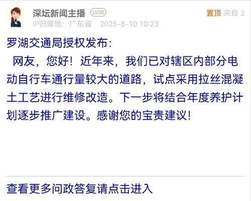 網(wǎng)友,您好!近年來,我們已對轄區(qū)內(nèi)部分電動自行車通行量較大的道路,試點采用拉絲混凝土工藝進行維修改造。下一步將結(jié)合年度養(yǎng)護計劃逐步推廣建設。感謝您的寶貴建議!