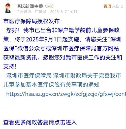 您好!我市已出臺非深戶籍學齡前兒童參保政策,將于2025年9月1日起實施,請您關注“深圳醫(yī)?!蔽⑿殴娞柣蛏钲谑嗅t(yī)療保障局官方網(wǎng)站獲取最新資訊。感謝您對我市醫(yī)保工作的關注和支持!