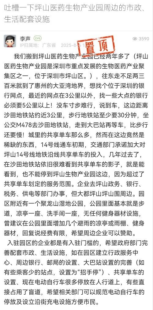 10. 帖文《吐槽一下坪山醫(yī)藥生物產(chǎn)業(yè)園周邊的市政、生活配套設施》