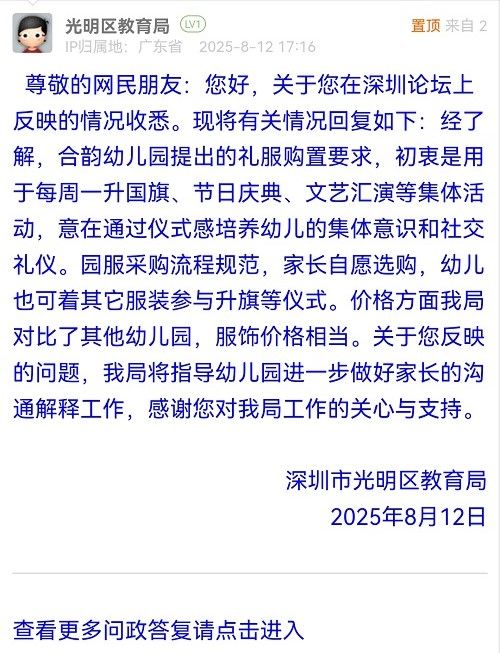 尊敬的網(wǎng)民朋友:您好,關于您在深圳論壇上反映的情況收悉?,F(xiàn)將有關情況回復如下:經(jīng)了解,合韻幼兒園提出的禮服購置要求,初衷是用于每周一升國旗、節(jié)日慶典、文藝匯演等集體活動,意在通過儀式感培養(yǎng)幼兒的集體意識和社交禮儀。園服采購流程規(guī)范,家長自愿選購,幼兒也可著其它服裝參與升旗等儀式。價格方面我局對比了其他幼兒園,服飾價格相當。關于您反映的問題,我局將指導幼兒園進一步做好家長的溝通解釋工作,感謝您對我局工作的關心與支持。