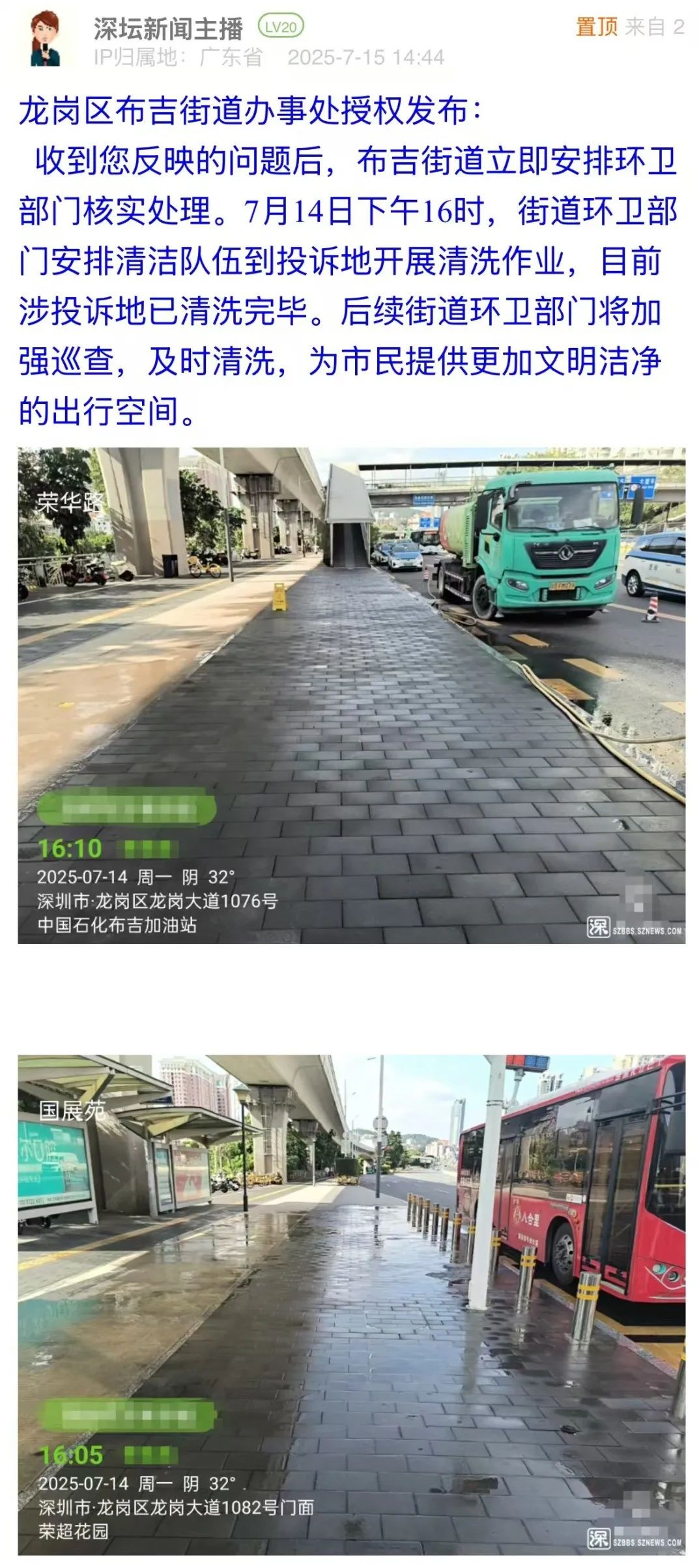 案例點(diǎn)評:對于市民反映的路面油污問題,布吉街道辦立即安排環(huán)衛(wèi)部門進(jìn)行清洗,并于第二日在問政帖文下進(jìn)行回復(fù),以現(xiàn)場圖片展示路面清理效果,表示將加強(qiáng)后續(xù)巡查。此次處置展現(xiàn)了基層部門高效務(wù)實(shí)的問題處理能力,為城市道路環(huán)境管理提供了快速響應(yīng)與長效維護(hù)相結(jié)合的實(shí)踐范例,切實(shí)回應(yīng)了市民對潔凈環(huán)境的期待。