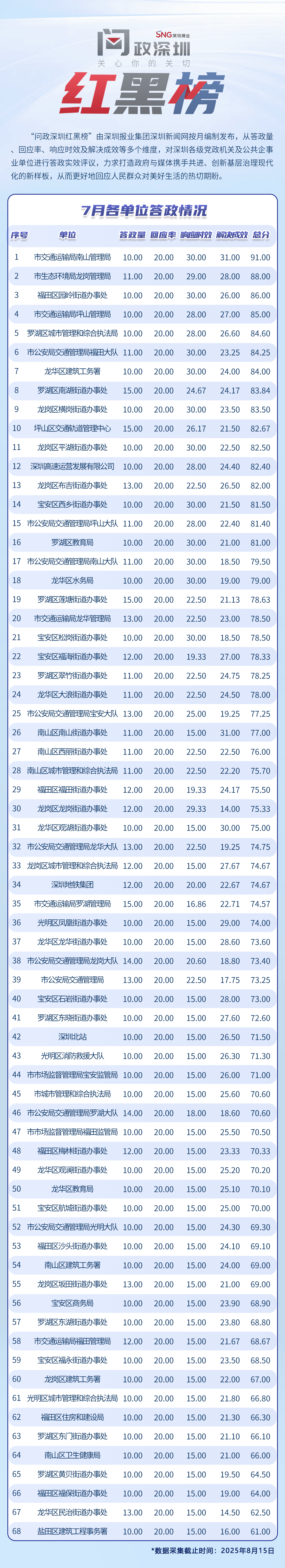 為探尋媒體如何精準(zhǔn)賦能基層治理現(xiàn)代化的“深圳路徑”,近日,深圳報(bào)業(yè)集團(tuán)正式掛牌成立“問政深圳”工作室,旨在進(jìn)一步推動(dòng)網(wǎng)絡(luò)問政工作的高效開展。為確保相關(guān)工作更加契合實(shí)際需求,深圳報(bào)業(yè)集團(tuán)深圳新聞網(wǎng)按照“最快速度辦結(jié)”的總體要求,將原有月度榜單創(chuàng)新升級為“問政深圳紅黑榜”,并對評分體系進(jìn)行了細(xì)致優(yōu)化。該榜單從答政量、回應(yīng)率、響應(yīng)時(shí)效及解決成效等多個(gè)維度,對深圳各級黨政機(jī)關(guān)及公共企事業(yè)單位進(jìn)行答政實(shí)效評議,力求打造政府與媒體攜手共進(jìn)、創(chuàng)新基層治理現(xiàn)代化的新樣板,從而更好地回應(yīng)人民群眾對美好生活的熱切期盼。