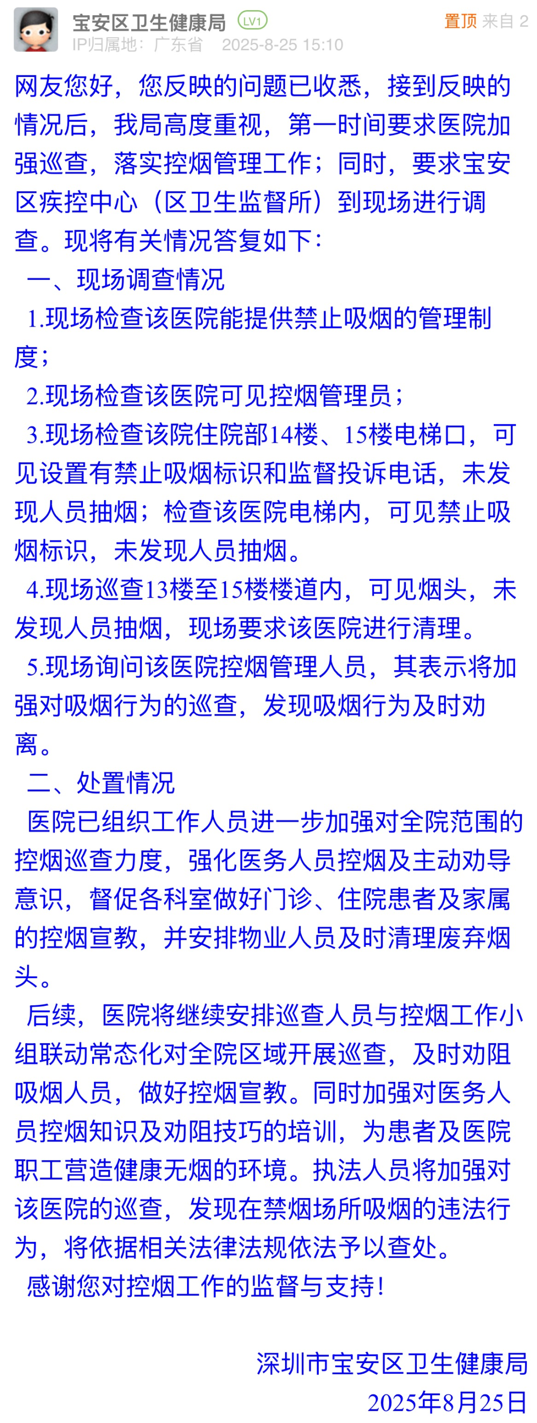 優(yōu)化建議:接到市民反饋后,寶安區(qū)衛(wèi)生健康局快速組織現(xiàn)場調(diào)查,核實醫(yī)院有禁煙制度、控?zé)煿芾韱T在崗,基礎(chǔ)控?zé)煷胧┖瞬榈轿?,值得點贊。但回應(yīng)中多次強(qiáng)調(diào)“未發(fā)現(xiàn)人員抽煙”,回避對歷史吸煙行為處置、煙頭來源及勸阻機(jī)制失效的解釋,與市民關(guān)切脫節(jié),難以消除市民對醫(yī)院日常控?zé)熌芰Φ膿?dān)憂,建議完善具體控?zé)煷胧缂友b煙感報警裝置,建立核查公示制度等,筑牢“無煙醫(yī)院”防線。
