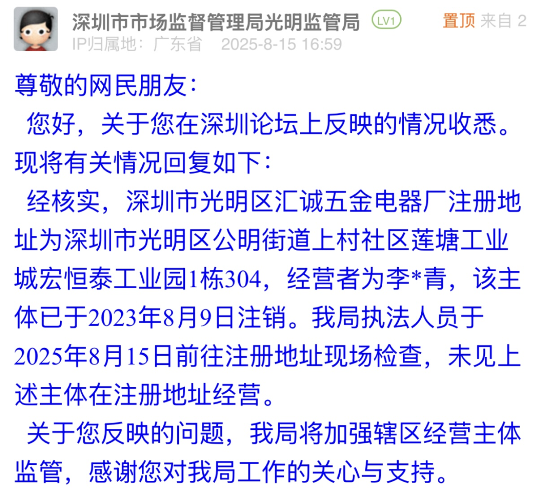 優(yōu)化建議:深圳市市場監(jiān)督管理局光明管理局的回應(yīng)中,核實了涉事電器廠已注銷,且不在注冊地經(jīng)營,也提及加強(qiáng)轄區(qū)主體監(jiān)管,但市民反映的排插套用注銷主體信息銷售、違規(guī)標(biāo)識3C標(biāo)志等關(guān)鍵問題,未得到明確解答。若回應(yīng)中能豐富指引類內(nèi)容,如告知市民可向平臺追責(zé)的途徑、提交證據(jù)的具體方式,為市民維權(quán)提供清晰方向,將更貼合市民需求,也能讓回應(yīng)更具實際意義。