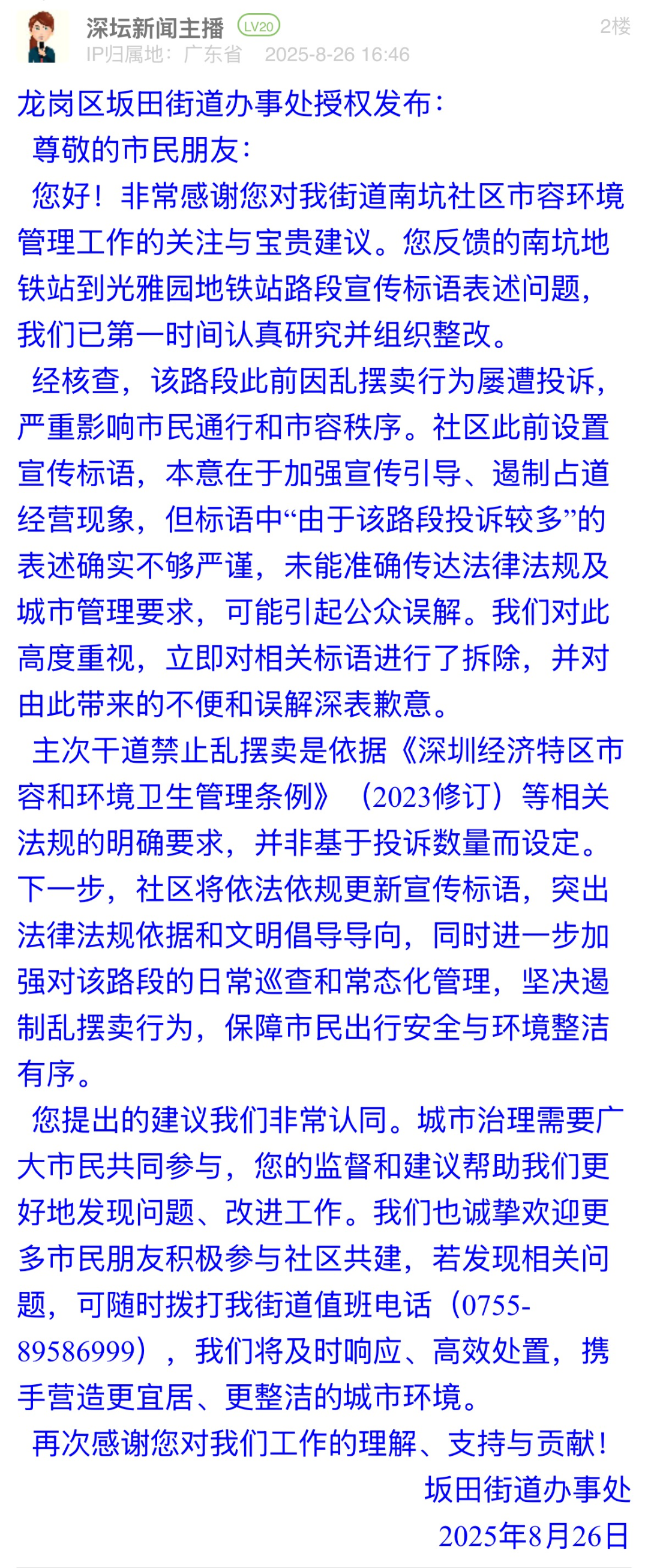 案例點評:標(biāo)語表述不嚴(yán)謹(jǐn)可能引發(fā)公眾誤解,坂田街道辦展現(xiàn)出高效務(wù)實的態(tài)度,第一時間拆除涉事標(biāo)語,計劃更新標(biāo)語,明確標(biāo)語中提及的禁擺依據(jù)為法規(guī)要求而非投訴數(shù)量?;貞?yīng)中,街道主動致歉并公開整改邏輯,展現(xiàn)“直面問題不推諉”的擔(dān)當(dāng),更以“邀請市民參與共建”為切入點,構(gòu)建“政府主導(dǎo)+公眾監(jiān)督”的治理閉環(huán)。此次整改有效化解因標(biāo)語表述不當(dāng)引發(fā)的公眾疑慮,彰顯了“以民為師”的共治智慧。