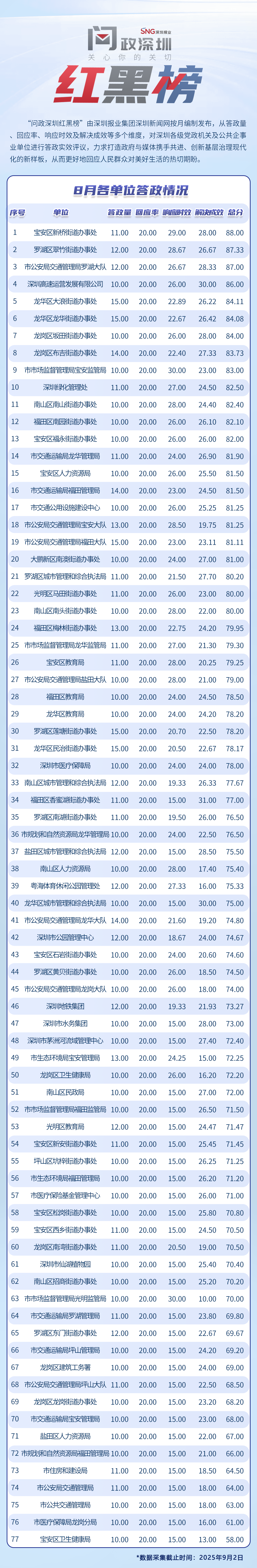 為探尋媒體如何精準(zhǔn)賦能基層治理現(xiàn)代化的“深圳路徑”,深圳報業(yè)集團(tuán)正式掛牌成立“問政深圳”工作室,旨在進(jìn)一步推動網(wǎng)絡(luò)問政工作的高效開展。為確保相關(guān)工作更加契合實際需求,自上期起,深圳報業(yè)集團(tuán)深圳新聞網(wǎng)按照“最快速度辦結(jié)”的總體要求,將原有月度榜單創(chuàng)新升級為“問政深圳紅黑榜”,并對評分體系進(jìn)行了細(xì)致優(yōu)化。該榜單從答政量、回應(yīng)率、響應(yīng)時效及解決成效等多個維度,對深圳各級黨政機(jī)關(guān)及公共企事業(yè)單位進(jìn)行答政實效評議,力求打造政府與媒體攜手共進(jìn)、創(chuàng)新基層治理現(xiàn)代化的新樣板,從而更好地回應(yīng)人民群眾對美好生活的熱切期盼。