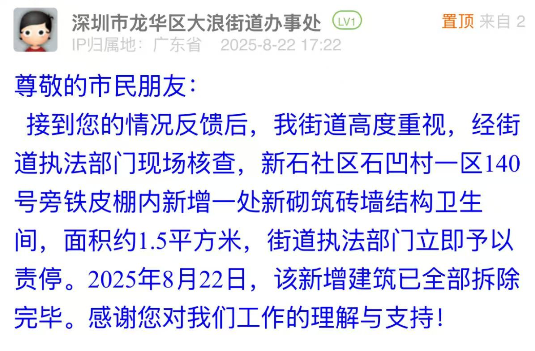 案例點評:8月21日晚間,市民發(fā)布帖文反映違建問題,大浪街道以“雷霆處置”展現(xiàn)安全至上的治理擔(dān)當(dāng)。接到投訴后,街道迅速核查,在22日給出回應(yīng),表示已完成拆除工作,做到了“速辦速結(jié),質(zhì)效雙優(yōu)”。此次響應(yīng)既體現(xiàn)“隱患即事故”的底線思維,更以“發(fā)現(xiàn)即拆除”的高效行動,彰顯基層治理對民生安全的敏銳感知與果斷處置能力,切實筑牢居民“身邊安全”防線。
