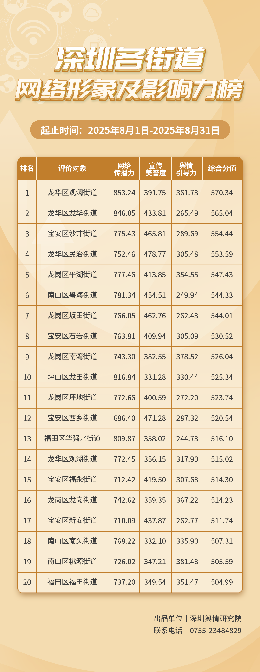 2025年8月,共有20個街道登上《深圳各街道網(wǎng)絡(luò)形象及影響力榜》,分別是:龍華區(qū)觀瀾街道、龍華區(qū)龍華街道、寶安區(qū)沙井街道、龍華區(qū)民治街道、龍崗區(qū)平湖街道、南山區(qū)粵海街道、龍崗區(qū)坂田街道、寶安區(qū)石巖街道、龍崗區(qū)南灣街道、坪山區(qū)龍?zhí)锝值馈垗弲^(qū)坪地街道、寶安區(qū)西鄉(xiāng)街道、福田區(qū)華強(qiáng)北街道、龍華區(qū)觀湖街道、寶安區(qū)福永街道、龍崗區(qū)龍崗街道、寶安區(qū)新安街道、南山區(qū)南頭街道、南山區(qū)桃源街道、福田區(qū)福田街道。