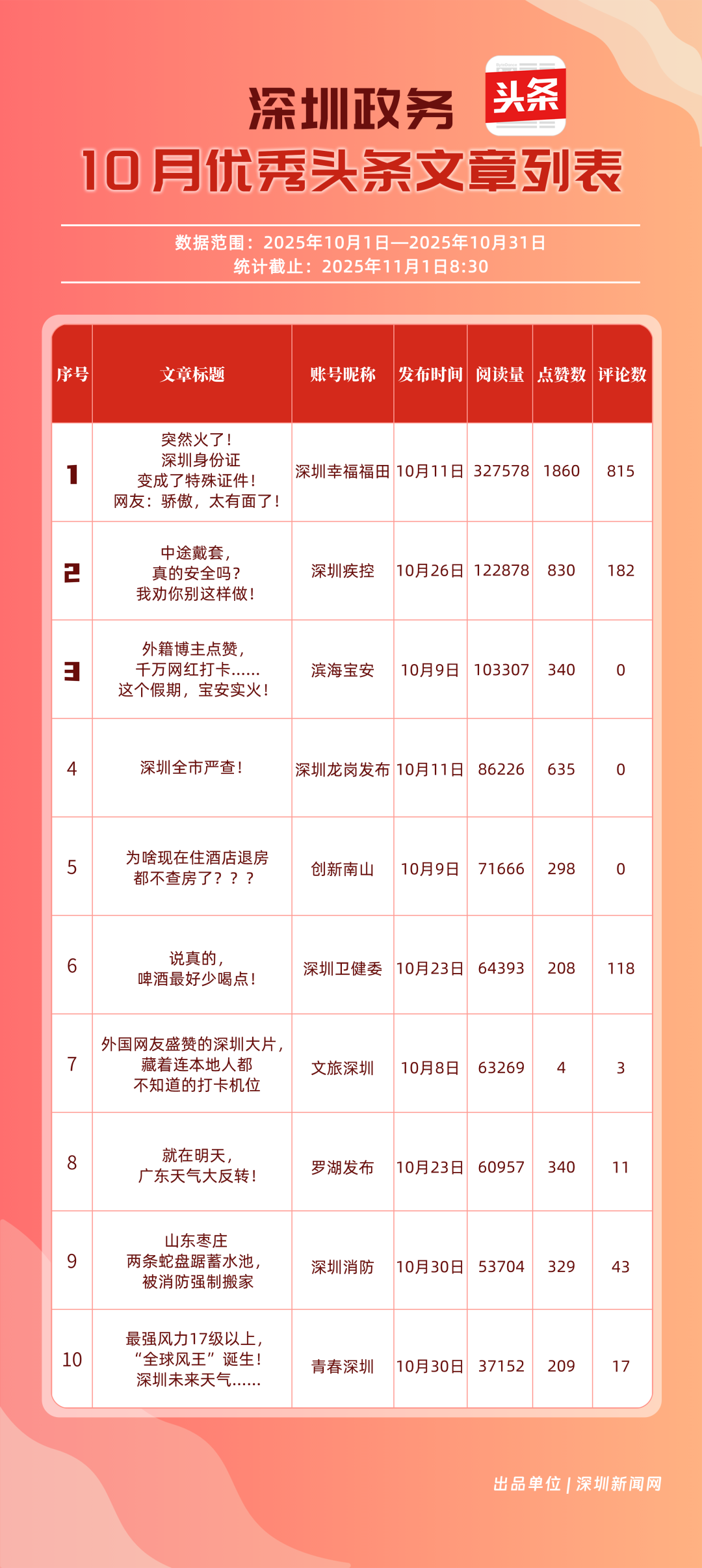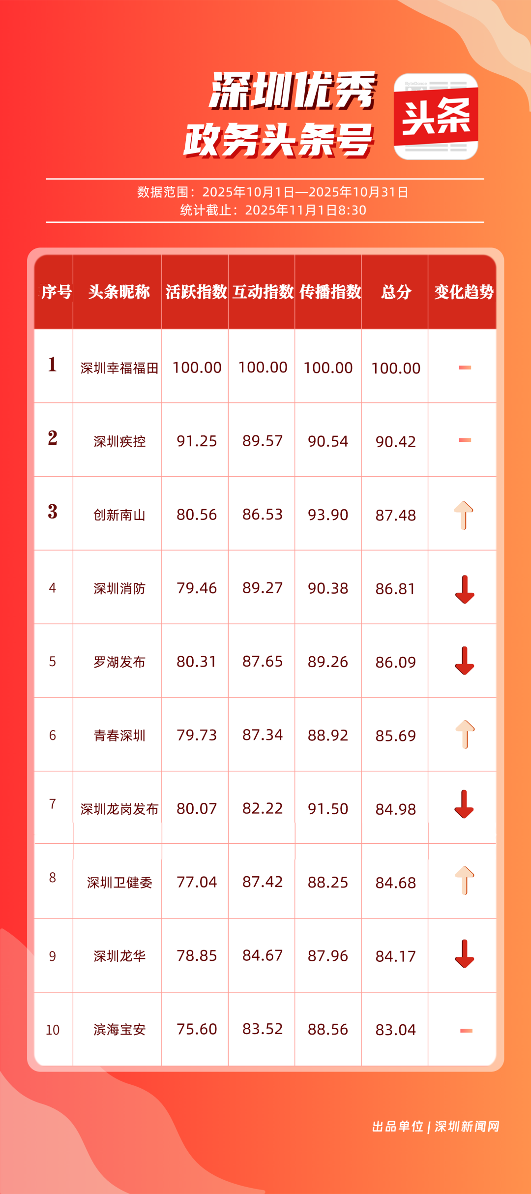 10月,“深圳幸福福田”“深圳疾控”“創(chuàng)新南山”“深圳消防”“羅湖發(fā)布”“青春深圳”“深圳龍崗發(fā)布”“深圳衛(wèi)健委”“深圳龍華”“濱海寶安”共10個(gè)政務(wù)頭條號入選“優(yōu)秀政務(wù)頭條號”榜單。“深圳幸福福田”在活躍、互動、傳播均收獲較好成果,蟬聯(lián)榜首;“深圳疾控”得分超90分,持續(xù)發(fā)布民生健康類內(nèi)容,為市民健康保駕護(hù)航;“創(chuàng)新南山”內(nèi)容創(chuàng)作緊扣民生與區(qū)域特色,位列榜單第三名?!吧钲谙馈薄傲_湖發(fā)布”等賬號也位列榜單前列,成為區(qū)域政務(wù)新媒體內(nèi)容創(chuàng)新、信息傳遞的標(biāo)桿。