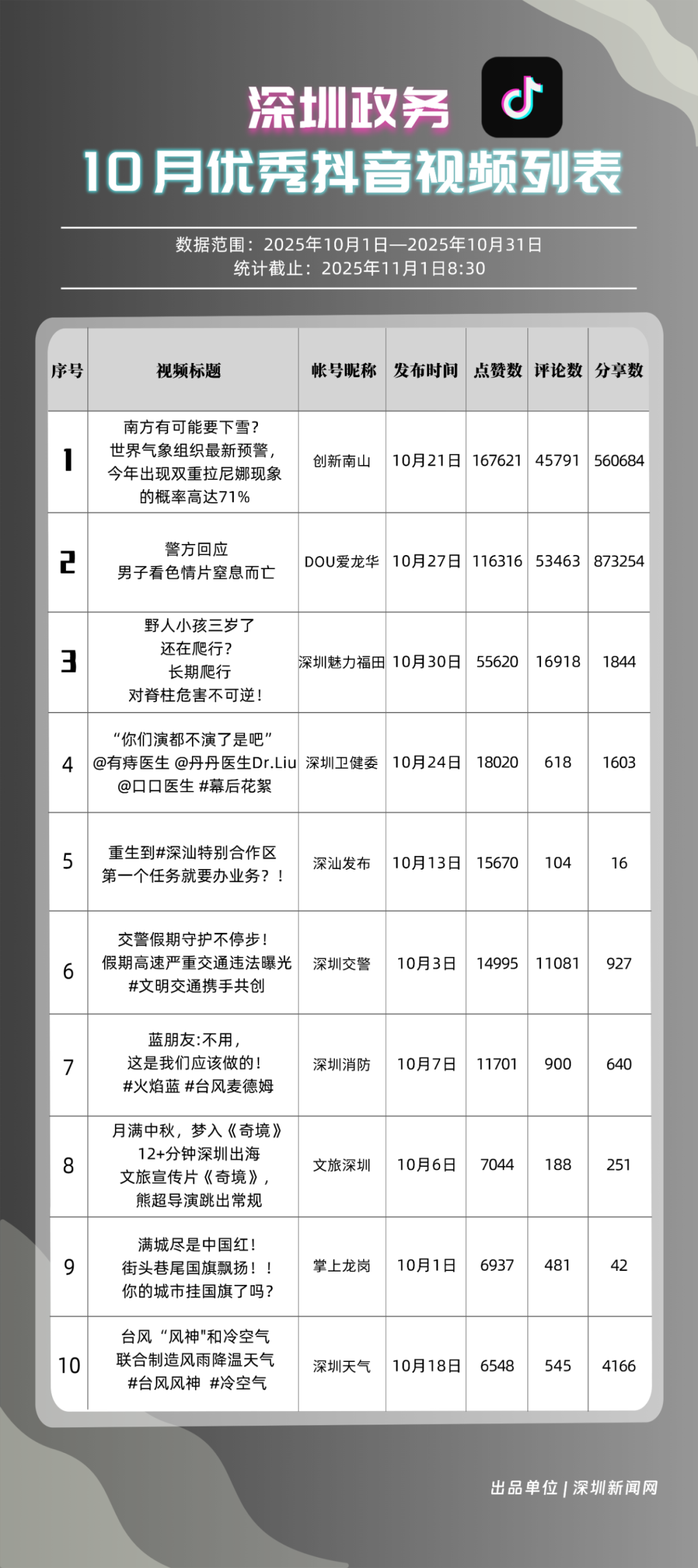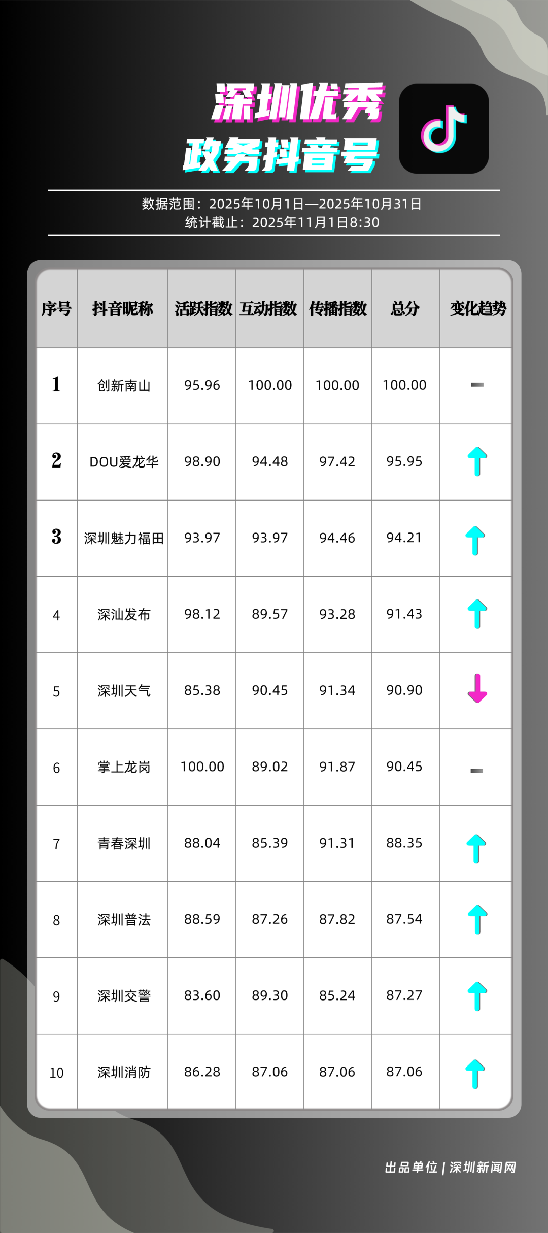 10月,獲得“優(yōu)秀政務(wù)抖音號”稱號的是“創(chuàng)新南山”“DOU愛龍華”“深圳魅力福田”“深汕發(fā)布”“深圳天氣”“掌上龍崗”“青春深圳”“深圳普法”“深圳交警”“深圳消防”。“創(chuàng)新南山”以總分100分居于榜首,展現(xiàn)出其內(nèi)容創(chuàng)作對用戶的強(qiáng)大吸引力與傳播力;“DOU愛龍華”與“深圳魅力福田”分別位列第二、三位,得分在95分左右,排名較上期有所上升。“深汕發(fā)布”“深圳天氣”“掌上龍崗”等賬號得分均在90分以上,以年輕化表達(dá)展示實(shí)用信息,也收獲較好互動、傳播成績。