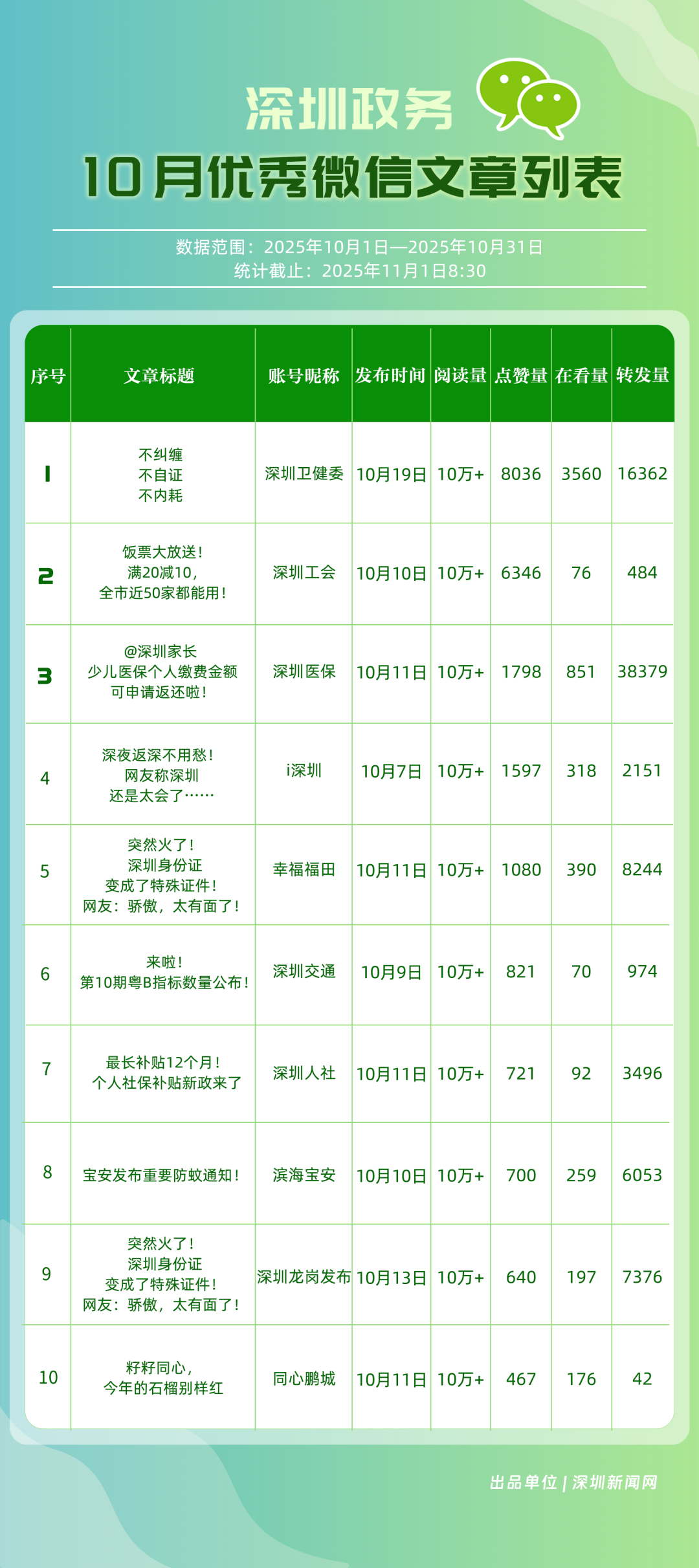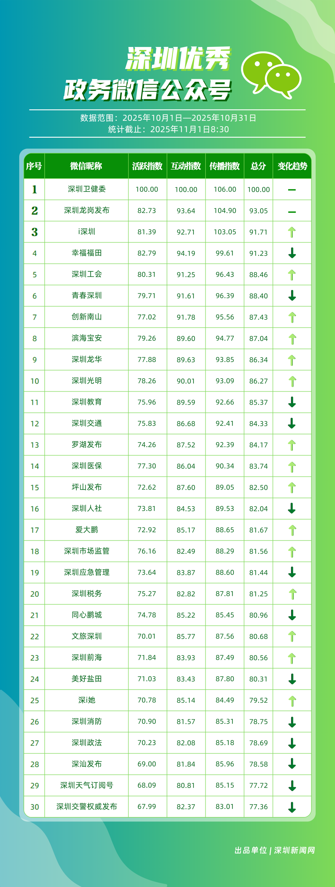 10月,“深圳衛(wèi)健委”“深圳龍崗發(fā)布”“i深圳”“幸福福田”“深圳工會”“青春深圳”“創(chuàng)新南山”“濱海寶安”“深圳龍華”“深圳光明”等30個(gè)政務(wù)微信公眾號榮登“深圳優(yōu)秀政務(wù)微信公眾號”榜單。10月,“深圳衛(wèi)健委”以總分100位居榜首,其持續(xù)以真誠、反套路的內(nèi)容,將專業(yè)健康知識轉(zhuǎn)化為網(wǎng)民喜聞樂見的“生活指南”,受到大量網(wǎng)民喜愛;“深圳龍崗發(fā)布”位居第二,持續(xù)發(fā)布高質(zhì)量內(nèi)容,成為市民獲取龍崗動態(tài)的“第一窗口”;“i深圳”也發(fā)布政策、民生內(nèi)容,排名有所上升,位列第三;“幸福福田”“深圳工會”等也立足區(qū)域特色,通過多元內(nèi)容,展現(xiàn)各自的發(fā)展活力。