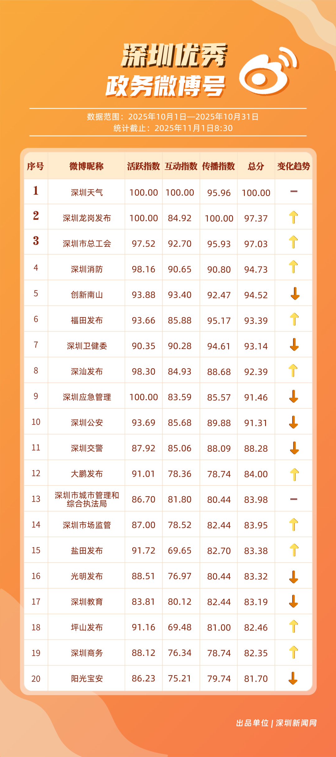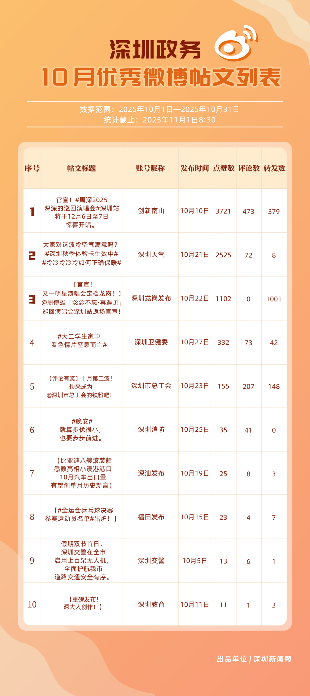 10月,20個(gè)賬號入選“優(yōu)秀政務(wù)微博號”榜單,其中包括:“深圳天氣”“深圳龍崗發(fā)布”“深圳市總工會”“深圳消防”“創(chuàng)新南山”“福田發(fā)布”“深圳衛(wèi)健委”“深汕發(fā)布”“深圳應(yīng)急管理”“深圳公安”等。其中,“深圳天氣”高頻、及時(shí)地發(fā)布天氣相關(guān)內(nèi)容,其中多篇關(guān)于“冷空氣”“入秋”帖文收獲較好互動和傳播效果,以100分位列榜單首位;“深圳龍崗發(fā)布”總分97.37分,居于榜單第二,其有關(guān)演唱會定檔、卷尺哥等內(nèi)容的帖文獲得較好數(shù)據(jù);“深圳市總工會”關(guān)注職工日常生活,以97.03分居于榜單第三?!吧钲谙馈薄皠?chuàng)新南山”等微博賬號也通過各自的特色內(nèi)容,展現(xiàn)深圳城市治理、民生服務(wù)的溫度。
