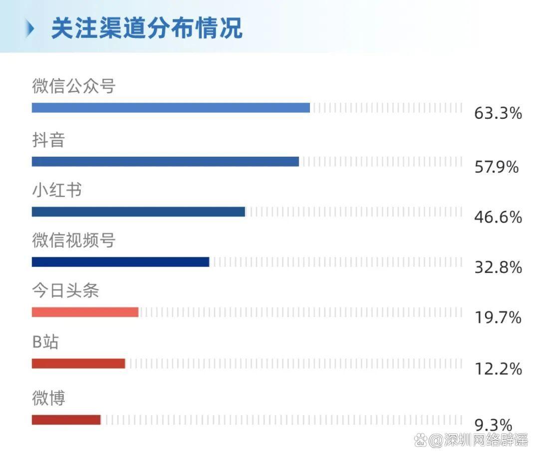 ·整體占比:微信公眾號(63.3%)、抖音(57.9%)占據(jù)主導(dǎo),小紅書、微信視頻號、今日頭條次之,B站(12.2%)、微博(9.3%)占比較低。