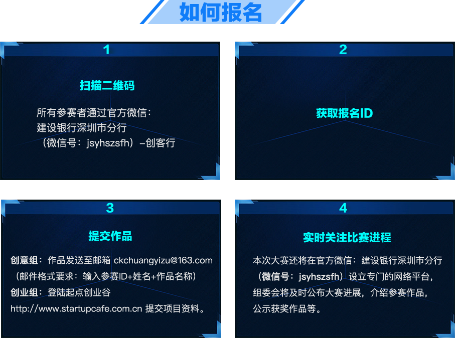 藍(lán)色夢工廠創(chuàng)客大賽由中國建設(shè)銀行深圳市分行、深圳國家高技術(shù)產(chǎn)業(yè)創(chuàng)新中心和建銀國際聯(lián)合主辦,積極響應(yīng)國家大眾創(chuàng)業(yè)萬眾創(chuàng)新,支持深圳的創(chuàng)客們實現(xiàn)夢想。大賽組委會將邀請創(chuàng)業(yè)專家、科技專家、風(fēng)險投資專家等對參賽項目的商業(yè)前景、創(chuàng)新性、成長性以及團(tuán)隊素質(zhì)等維度進(jìn)行綜合考察。我們將為獲獎創(chuàng)客團(tuán)隊提供豐厚獎金、融資支持、初創(chuàng)企業(yè)金融套餐、免費赴英國開展企業(yè)參訪交流、高新區(qū)孵化器場地優(yōu)先入駐、價格優(yōu)惠以及媒體曝光、品牌推廣等多項支持。