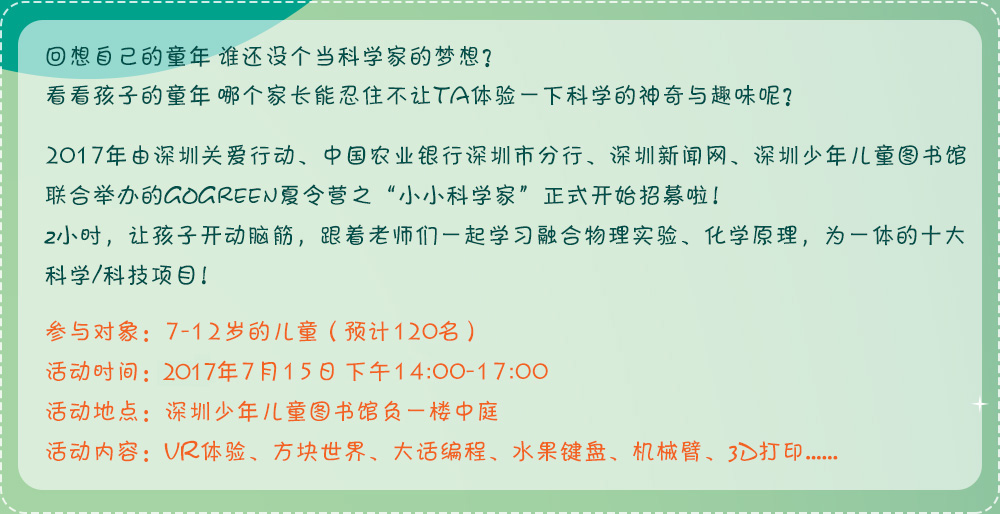 GO GREEN綠色夏令營之“小小科學(xué)家”活動(dòng)由深圳市關(guān)愛辦、中國農(nóng)業(yè)銀行深圳市分行、深圳新聞網(wǎng)、深圳市少年兒童圖書館聯(lián)合舉辦。2個(gè)小時(shí)的活動(dòng),讓孩子開動(dòng)腦筋,跟著老師學(xué)習(xí)融合物理實(shí)驗(yàn)、化學(xué)原理,為一體的十大科學(xué)/科技項(xiàng)目。[詳細(xì)]